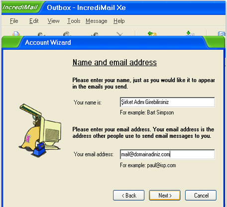 Your name is bölümüne gözükmesini istediğiniz bir isim yazınız ve Your email address bölümüne email hesabınızın tamamını yazınız. Next> butonuna basıp devam ediniz.