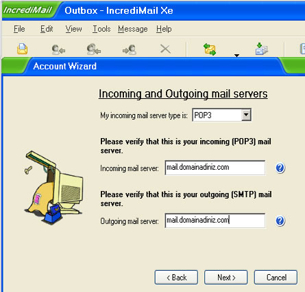My incoming mail server type is bölümünde POP3 seçili iken , Incoming ve Outgoing mail server ayarlarınız mail.domainisminiz.com şeklinde ayarlayınız.