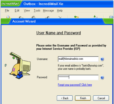 Username bölümüne email adresinizin tamamını giriniz ve email şifresini Password bölümüne yazınız. Finish butonuna basarak devam ediniz..