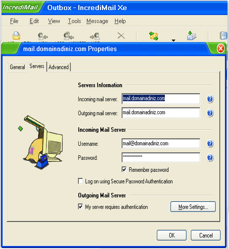 Açılan pencereden Servers sekmesine basalım ve altta bulunan My server requires authentication kutusunu işaretleyelim. OK butonuna basarak işlemi tamamlayalım.