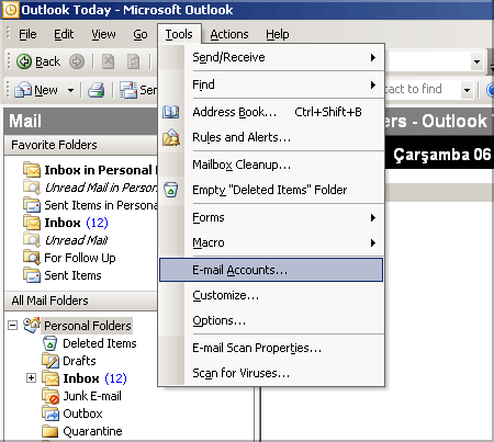 Microsoft Outlook 2002 mail programınızı açarak aşağıda gösterilen sekmeleri takip ediniz.