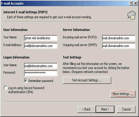 Yeni Hesap eklemek için de aşağıdaki resime göre bilgilerinizi yazıp More Settings (Diğer Ayarlar) butonuna basınız.