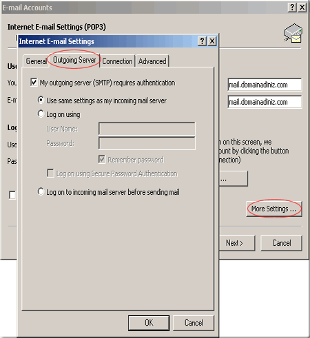 Bu aşamada Outgoing Server (Giden Sunucu) sekmesine basalım. Ayarlarınız aşağıda gördüğünüz gibi olmalıdır. Bir sonraki aşama için OK (Tamam) butonuna basınız.