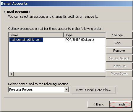 Yeni eklediğiniz veya değişiklik yaptığınız hesabınızı Finish (Bitir) butonuna basarak tamamlayınız. Şimdi mail programınızın ana menüsünden POP3 mail hesaplarınıza gelen mesajları alabilir ve yeni mesajlar gönderebilirsiniz.
