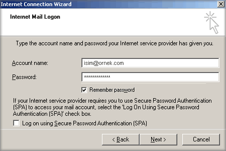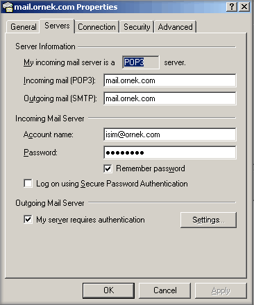 Gelen (Pop3) ve giden (Smtp) sunucularınızı aşağıdaki örneğe göre; mail.ornek.com şeklinde yazınız. Giden posta (SMTP) sunucusuna kullandığınız ISP'nin mail server adresini de yazabilirsiniz.